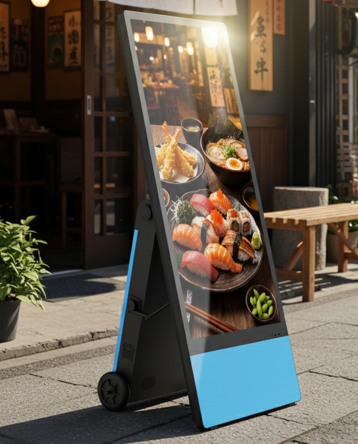 電源不要で最大20時間稼働。IP55の防水防塵性能と、太陽光下でも鮮明な自動調光システム(1800nits)を搭載。灼熱の太陽(110℃対応)から氷点下(-50℃対応)まで、あらゆる環境で情報を発信し続ける、まさに「タフネス」な一台です。飲食店の店頭や屋外イベントに最適です。